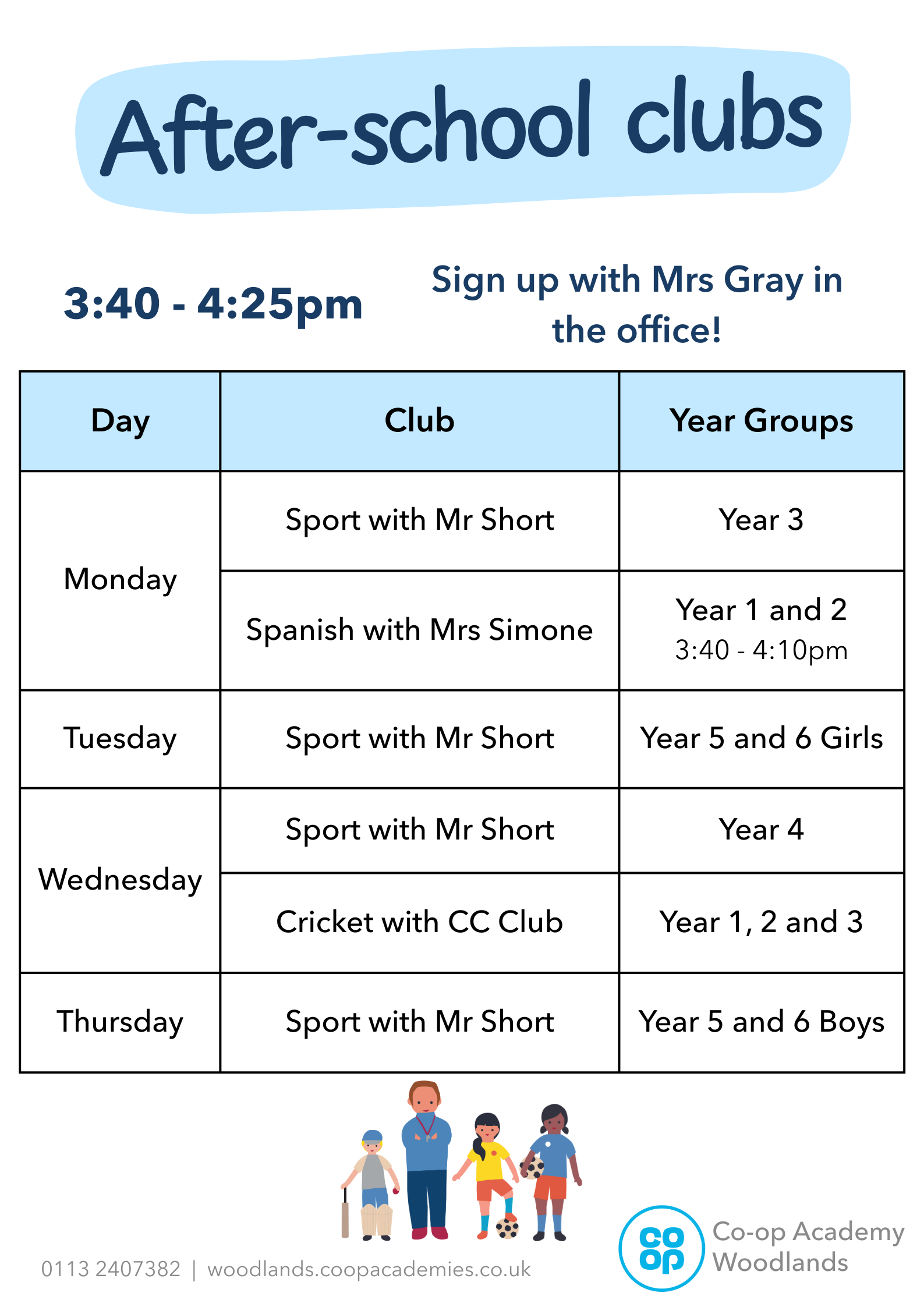 Have a look at our after-school clubs. These run every day after school, 3:40 - 4:25pm.