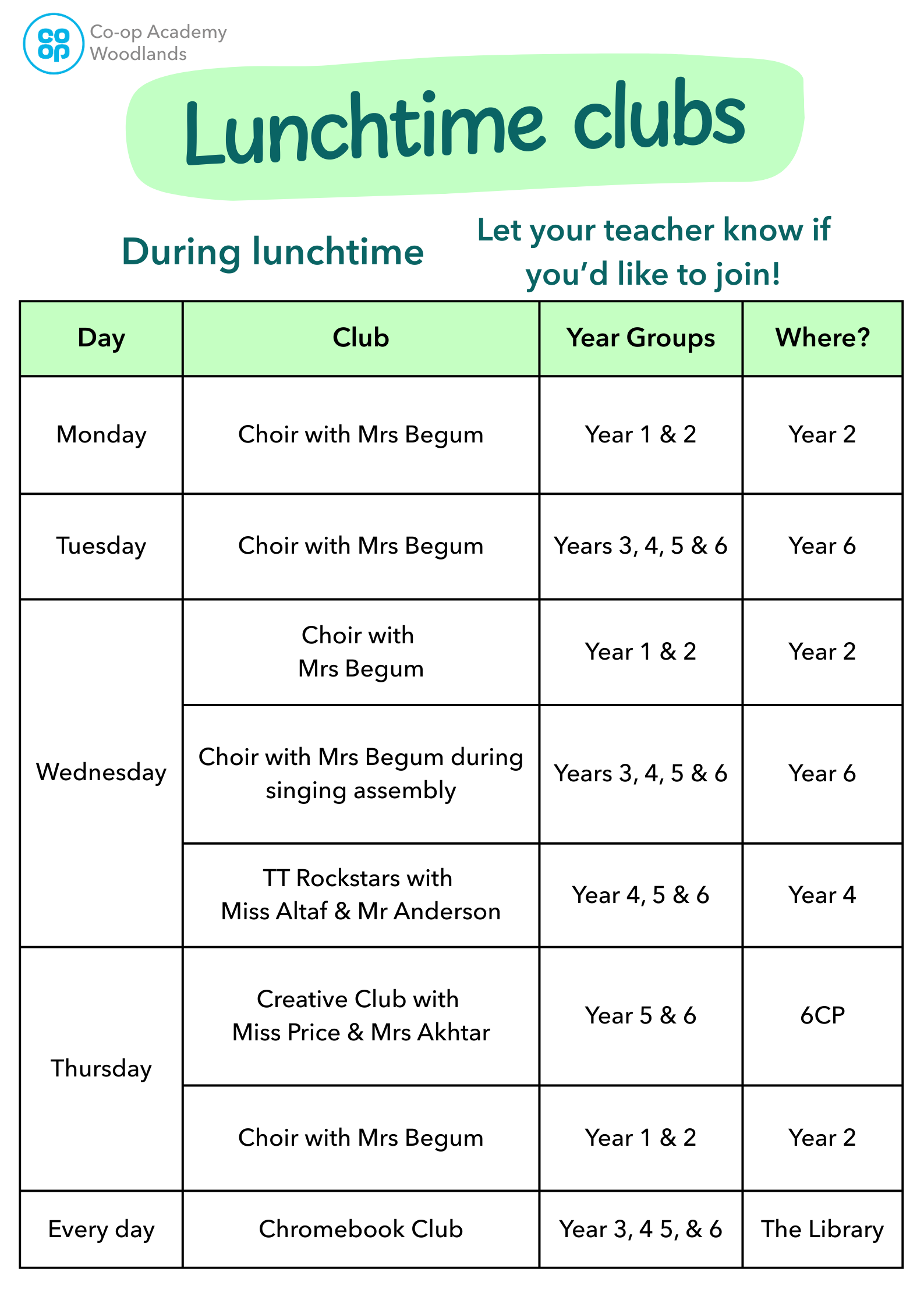 We have a range of clubs that take place during the school day too. Children do not need permission to attend these clubs and can sign up with their teacher or the club leader.